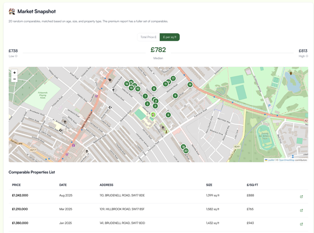 Automatically matches a property to other sold properties that have similar characteristics (same build era, similar floor size, same property type). Users can get up to 20 sold price comparables for free and market trends for their exact property type. No more manually doing this exercise or using services behind a paywall.