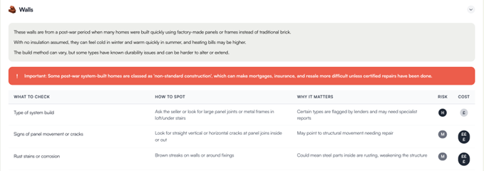 Convert publicly available EPC data into a highly specific viewing checklist. Gives the buyer detailed context on the property, what to look for in viewings and how. Raises potential red flags the buyer should be aware of, including things that might impact mortgageability and insurance.